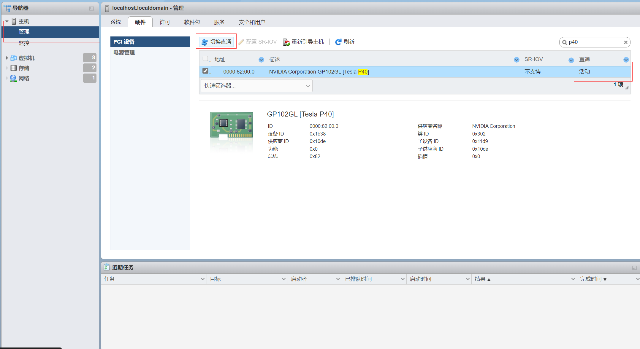 - 如果点击切换了直通且重启了,发现直通项还是没有显示“活动”,可能没有开启BIOS的 above 4GB或者ESXI的版本不支持P40直通